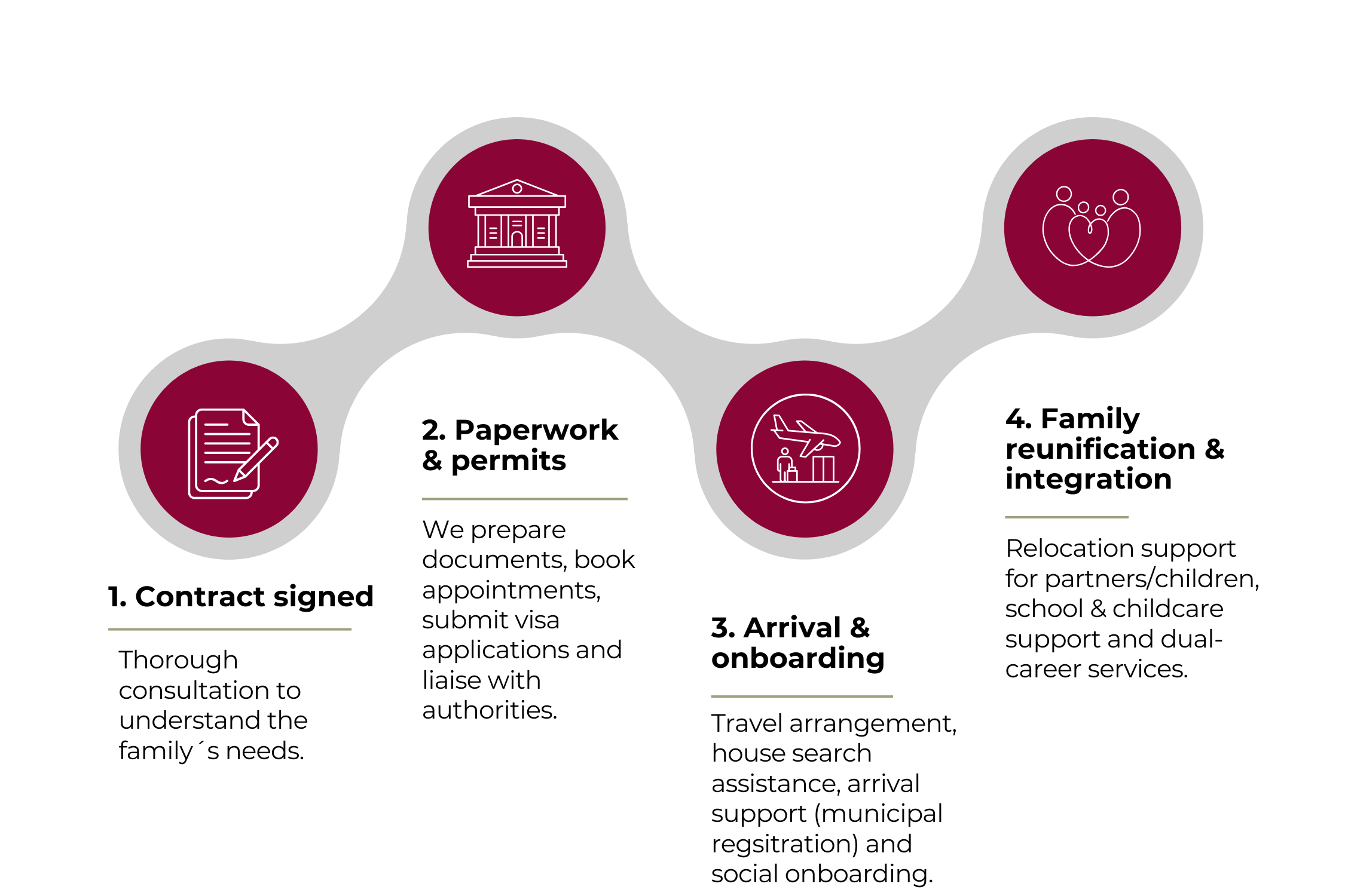 4. Family reunification & integration: Full relocation for partners/children, school & childcare support, and Dual-Career services.